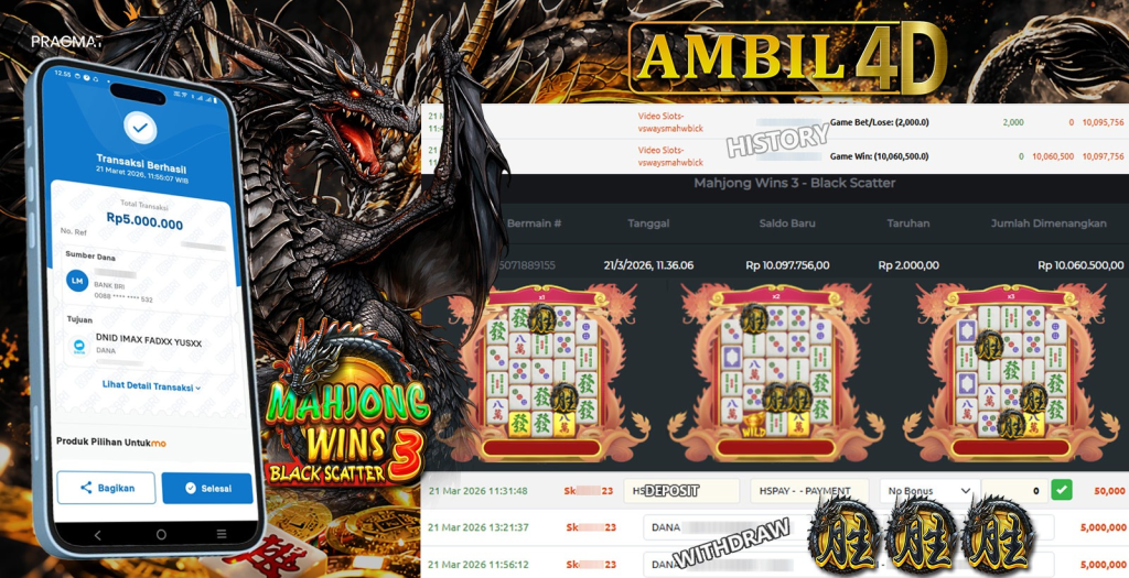 Kemenangan Mahjong Wins 3 – Black Scatter β Akumulasi JP jutaβan dan belasan juta Setiap Spin Dari tampilan history yang ditunjukkan, member mendapatkan beberapa kemenangan penting: